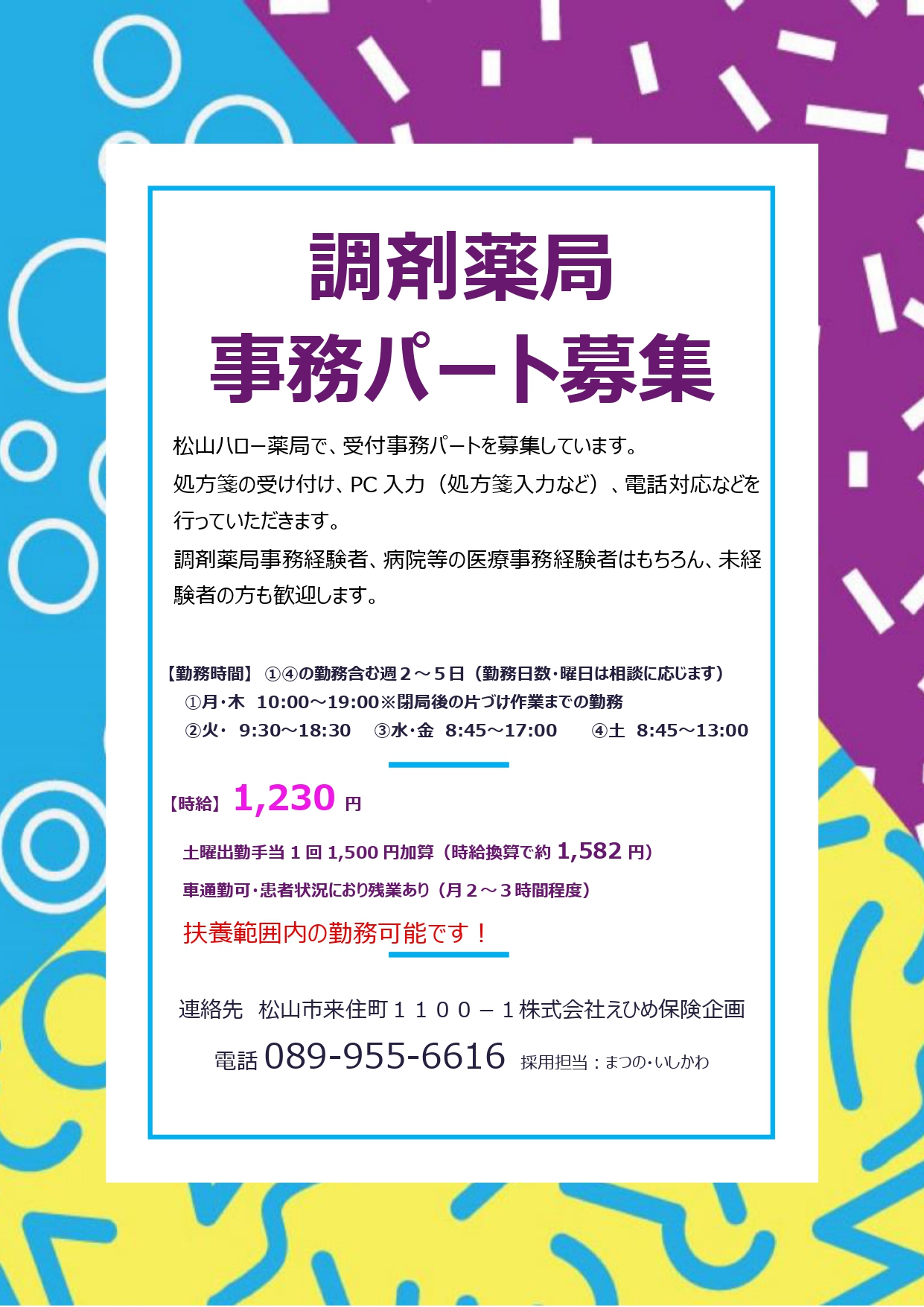 | 2018年6月6日 | 6月5日の採用試験は終了しました。 2019卒採用は随時受付しています。 担当者までご連絡ください。 担当:林 ℡ 089-990-8677 |